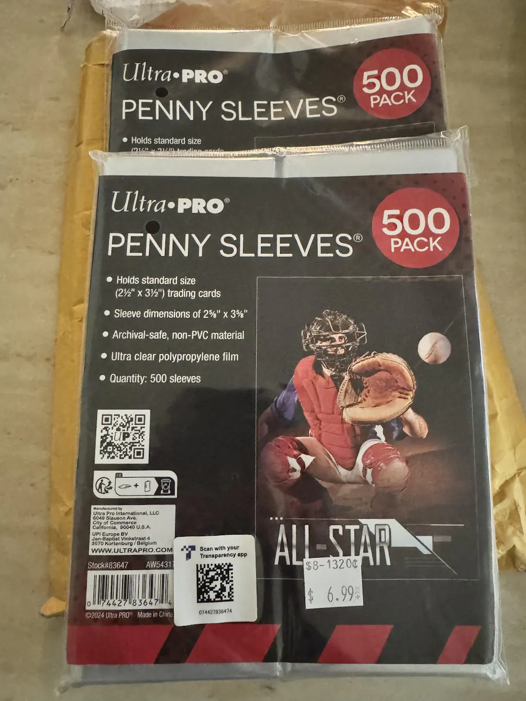 Protect your trading cards from dirt and dust with Ultra PRO card sleeves. Made with non-PVC, ultra clear polypropylene film, these sleeves are a must for any trading card collector looking to preserve the value of their trading cards. Sized to fit standard cards measuring 2.5" x 3.5". Each pack comes with 4 inner packs of 125 sleeves per pack, totaling 500 sleeve per pack.